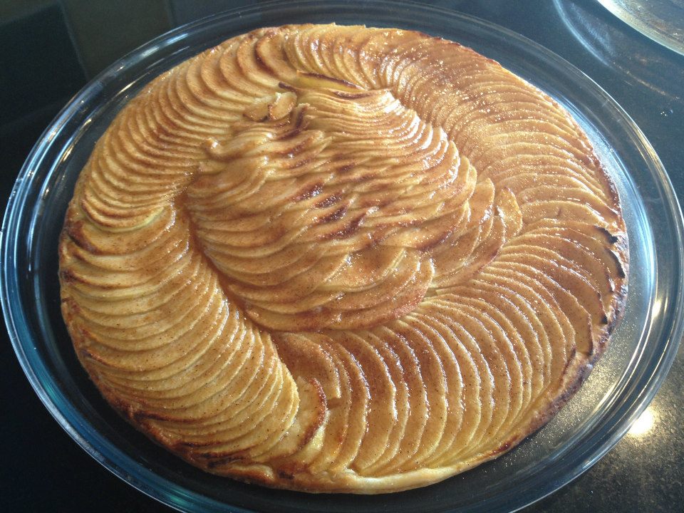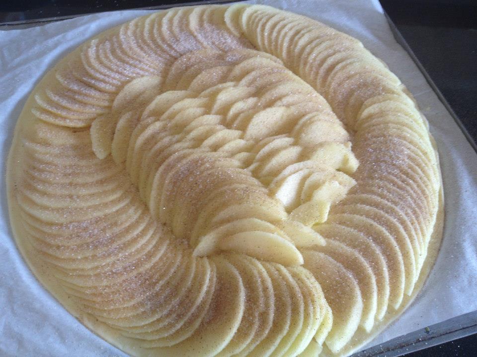 Aplatir du plat de la main les demi pommes coupées en faisant une courbe et commencer à garnir la pâte en commençant par l’extérieur.