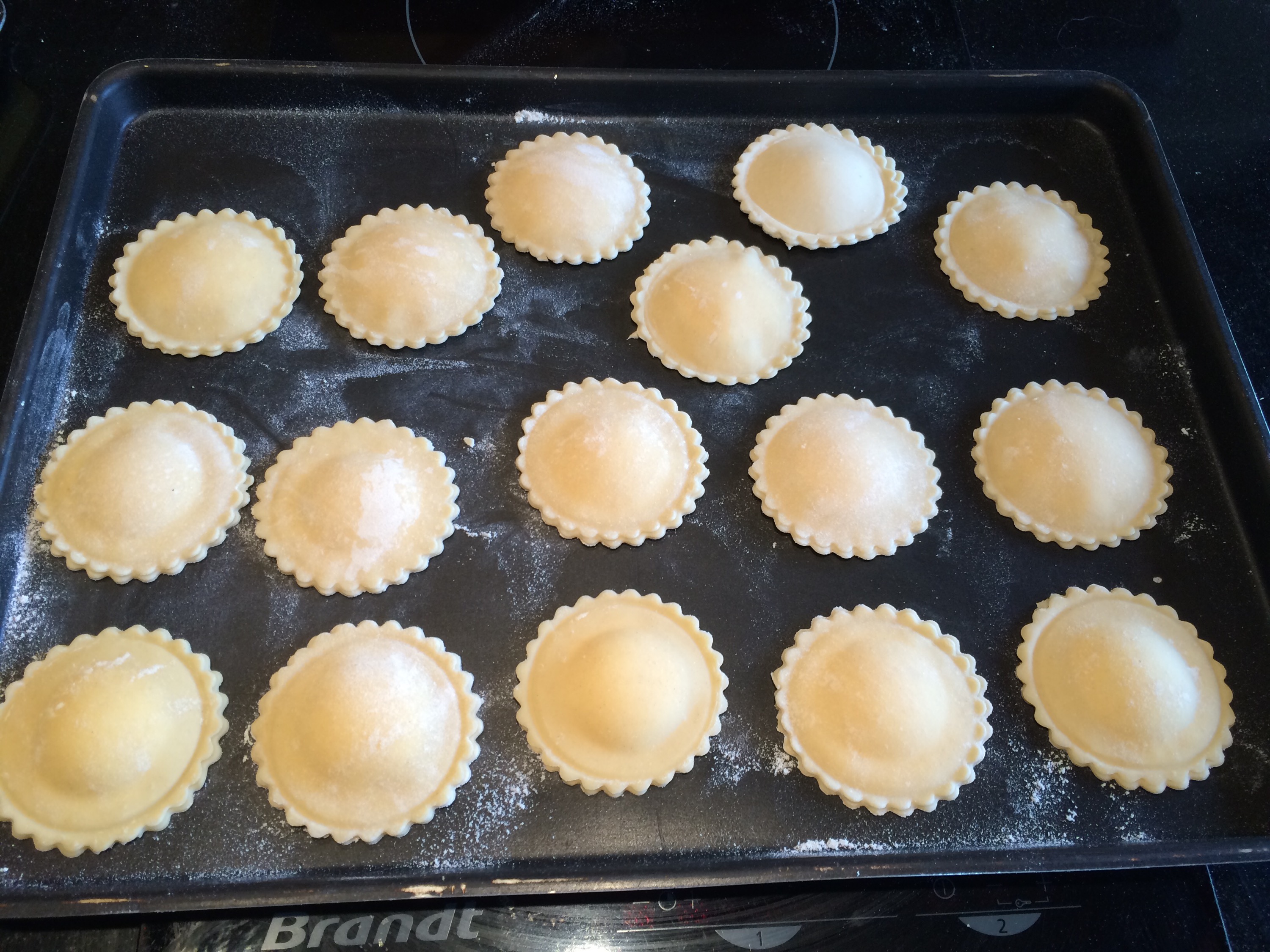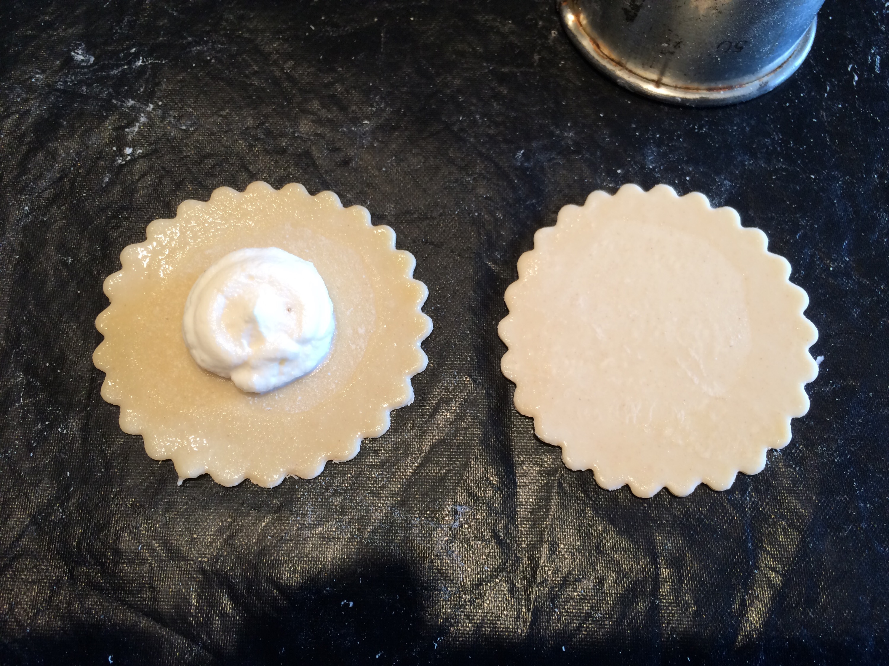 Mettre une noisette de ricotta au centre d’un disque de pâte, et poser dessus un autre disque en ayant avant, mouillé à l’aide d’un pinceau les bords intérieurs avec de l’eau des 2 disques pour les coller.