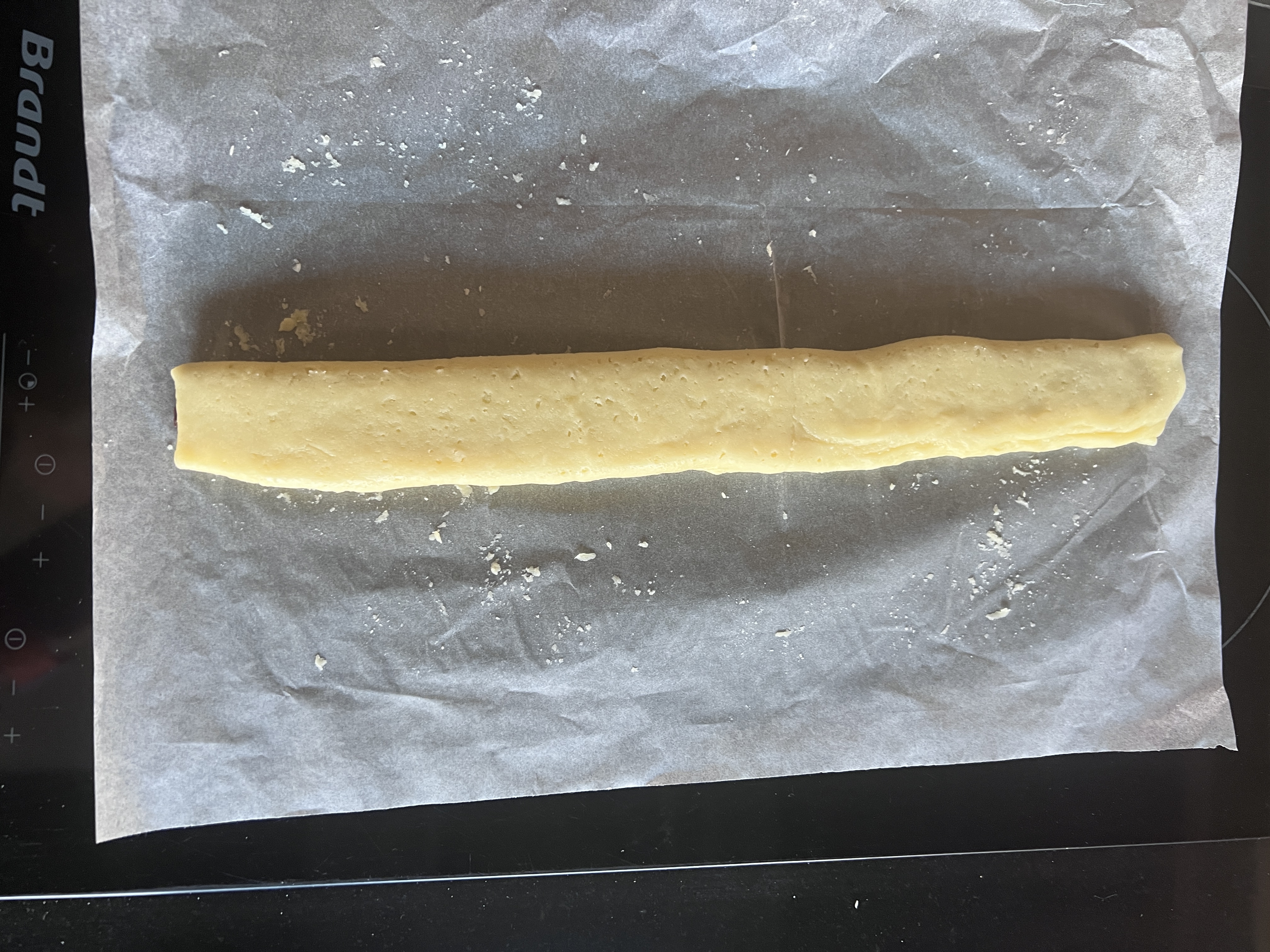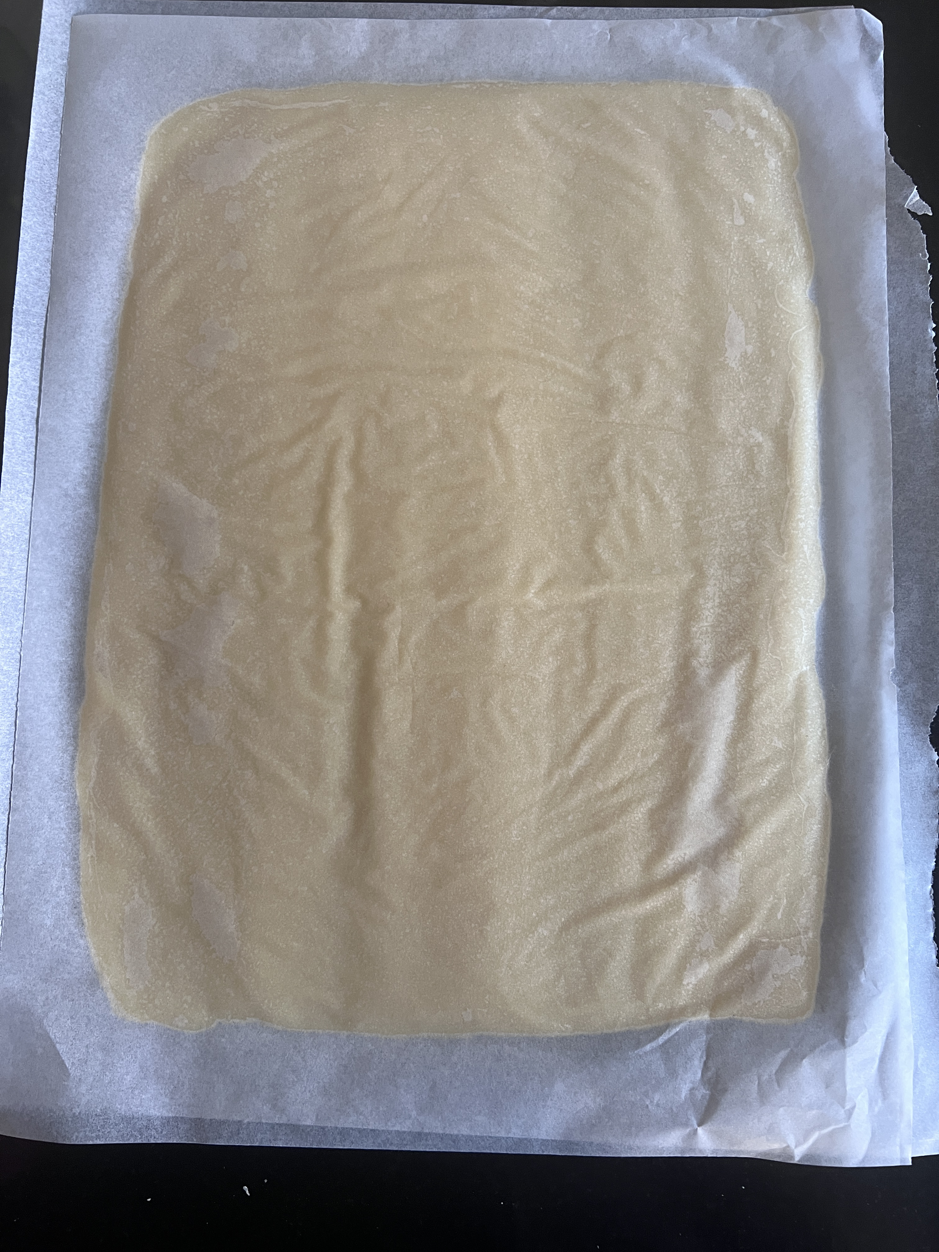 Étaler la pâte en rectangle entre deux feuilles de papier sulfurisé, à l’aide d’un rouleau jusqu’à environ 3 à 4 mn d’épaisseur.