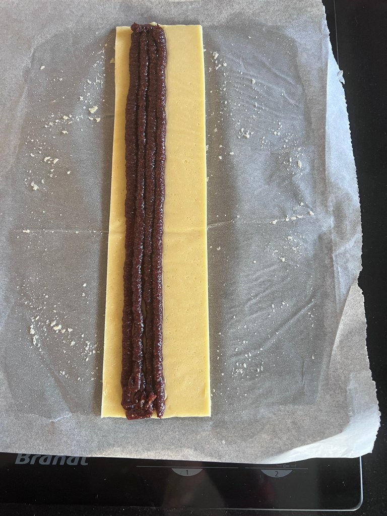 Mettre la pâte de figue dans une poche et faire un boudin le long d’un bord de la bande de pâte.