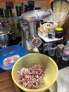Dans un hachoir avec une grille à gros trous, hacher tout (viande , les aromates, l’oignon et girolles).