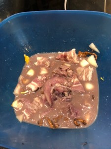 La veille au soir, désosser le faisan et couper la poitrine et dés de 4 cm environ mettre dans un saladier, les morceaux de faisan, la poitrine, l’oignon, le thym, le laurier une cuillère à café rase de sel, du poivre du moulin( poivre noir),une pincée de muscade en poudre, les girolles déshydratées et arroser le tout de 1/2 à 3/4 de la bouteille de vin rouge selon de saladier, le liquide doit recouvrir très légèrement la viande.