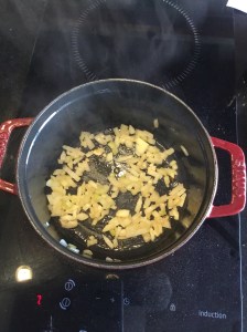 Dans une cocote en fonte, faire revenir l’oignon émincé dans de l’huile d’olive