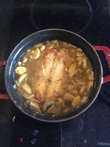 Ajouter le thym et le laurier, puis le foie de lapin si il y en avait un et la gousse d’ail écrasée.