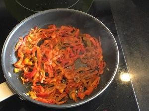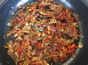 Réunir les oignons et les poivrons, bien mélanger et tapisser un plat à four.