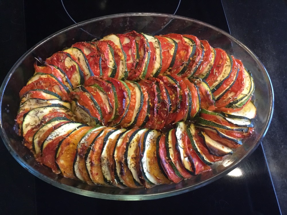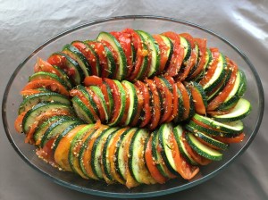 Mettre les rondelles de courgette et les tomates en alternance sur la compotée d’oignon poivron.