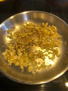 Dans une poêle verser une cuillère a soupe d’huile d’olive et faire dorer l’oignon émincé et l’ail écrasée