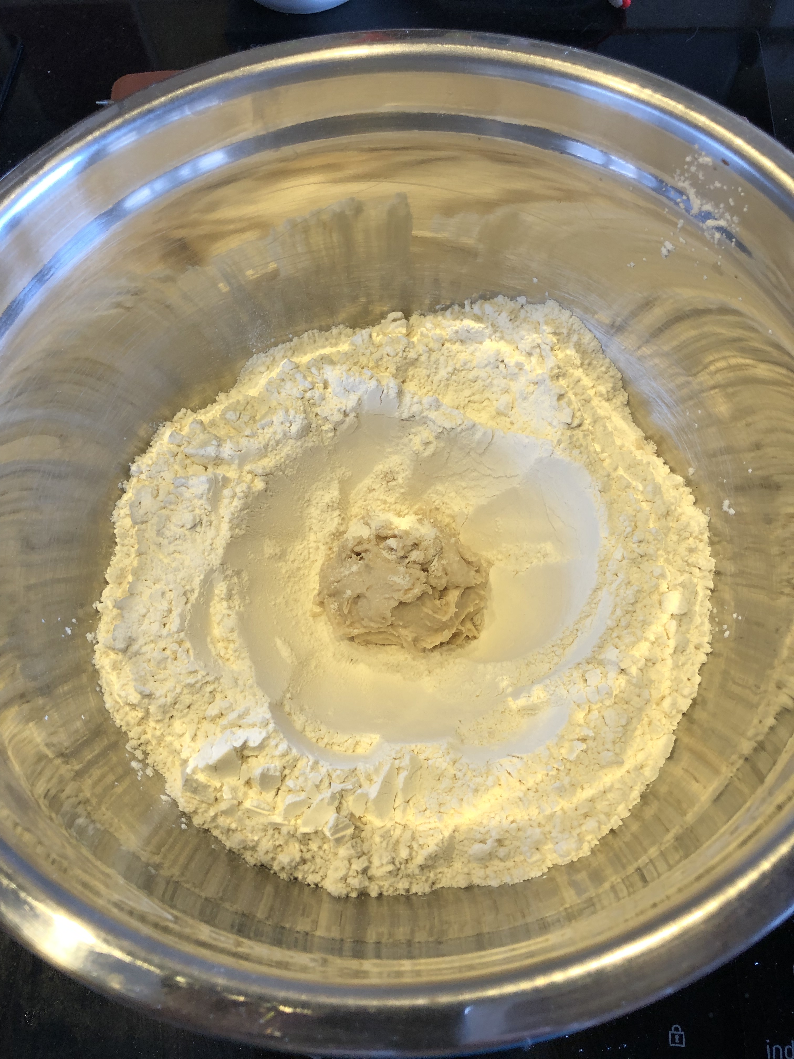 Mélanger le tout durant 2 min, à vitesse réduite, à l’aide d’un robot-ménager équipé d’un crochet à pâte.