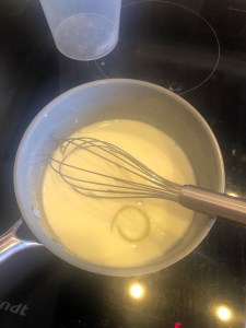 Retirer-le alors du feu puis couler le sucre sur le mélange lait/farine petit à petit en remuant avec un fouet.