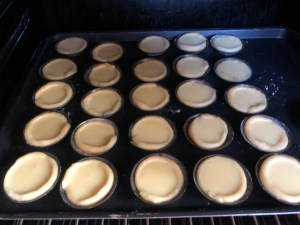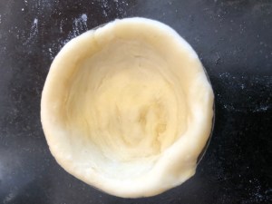 Poser une tranche dans un petit moule à tartelette et écraser-la avec le pouce en commençant par le milieu et bien foncer le moule. Si cela colle un peu tremper vos pouces dans un peu de farine.