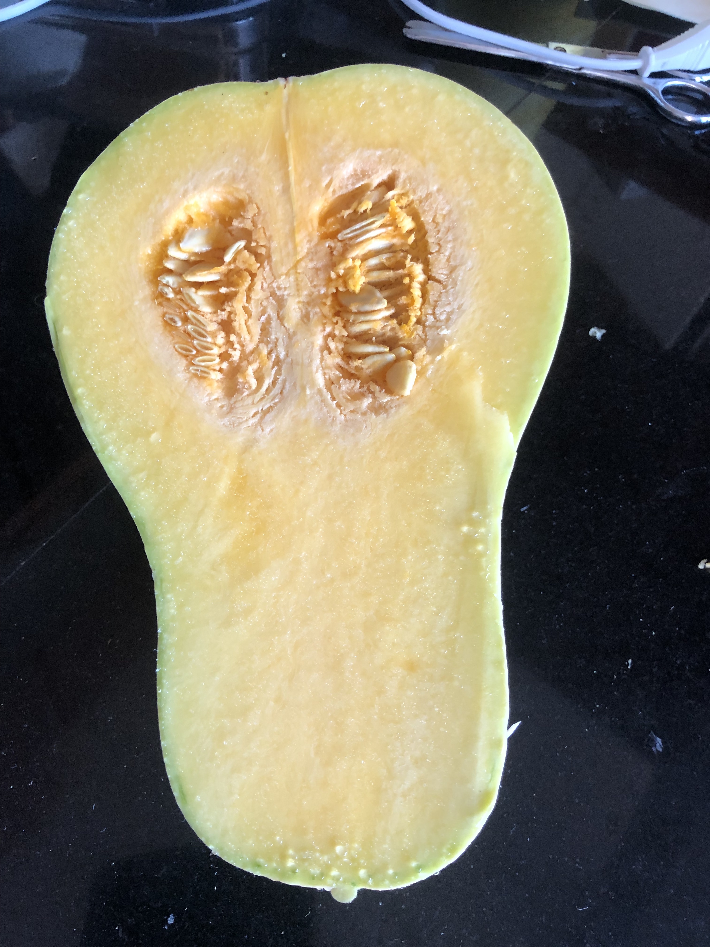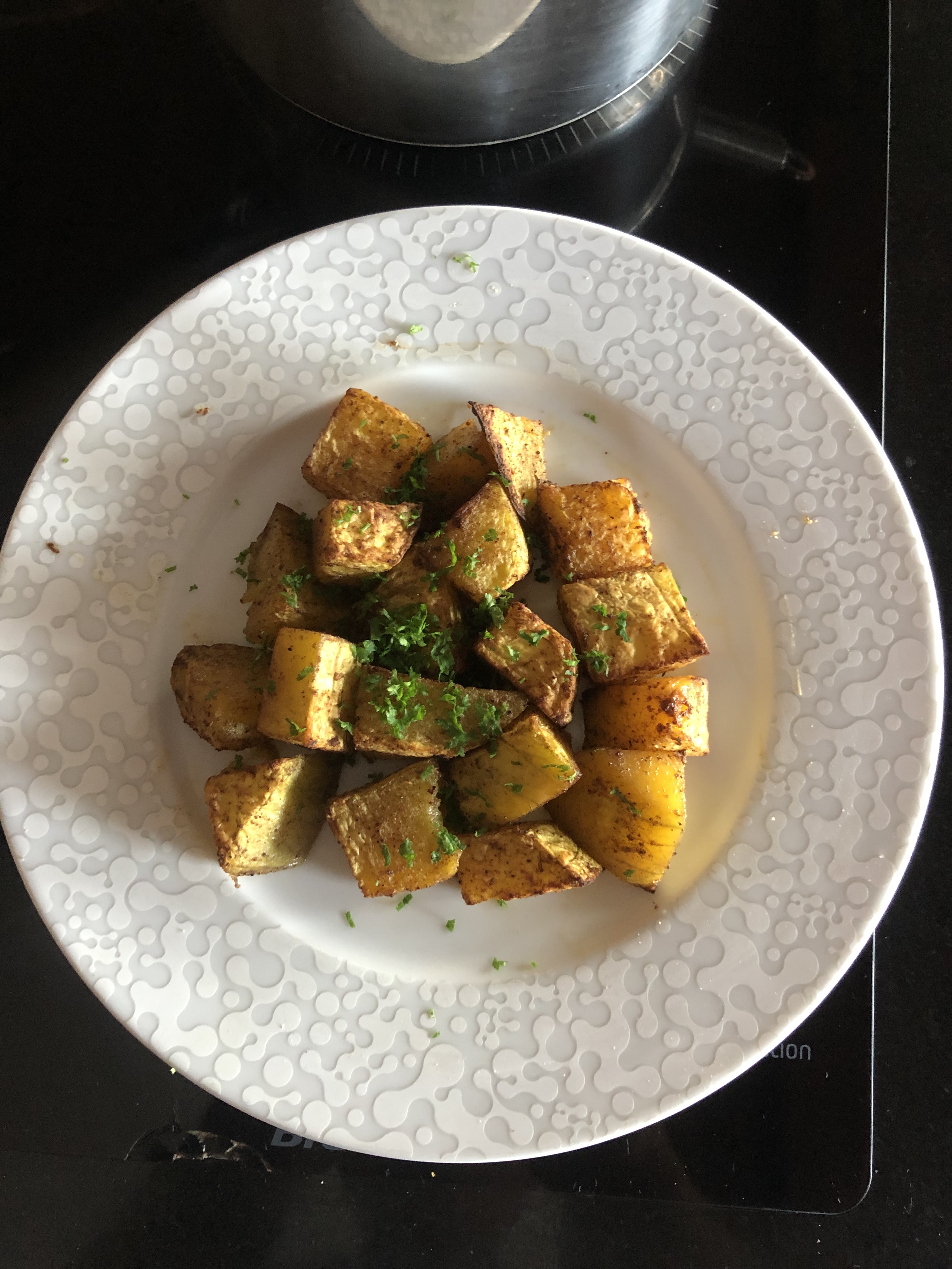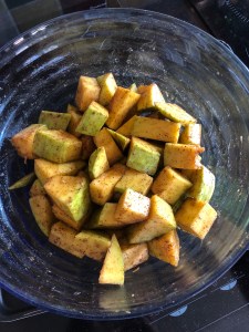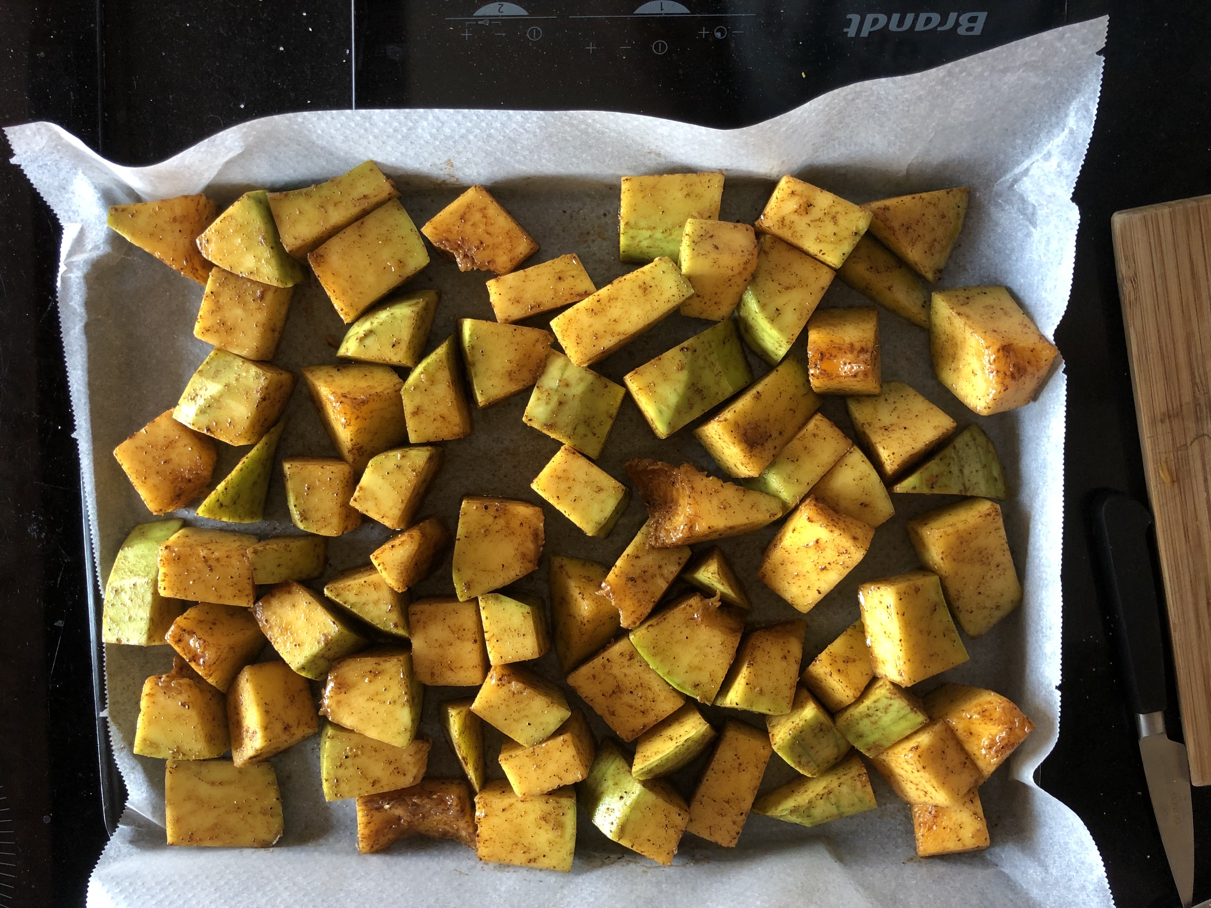 Dans un saladier, mettre les cubes de courge, les 4 épices, le piment d’oiseau, 2 cuillère a soupe l’huile d’olive.