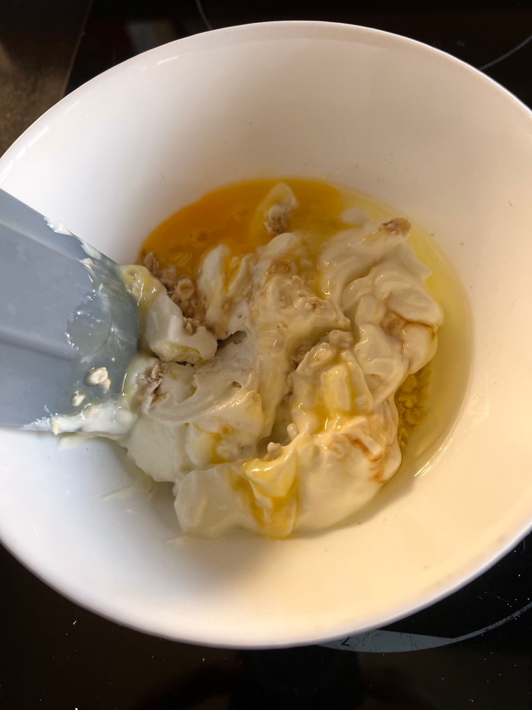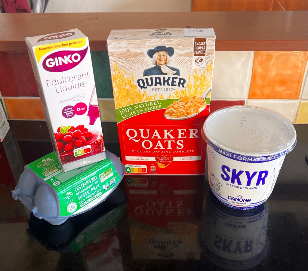 Dans un bol mettre les flocons d’avoine et le Skyr, ajouter l’œuf, l’édulcorant, la vanille et l’arôme orange.