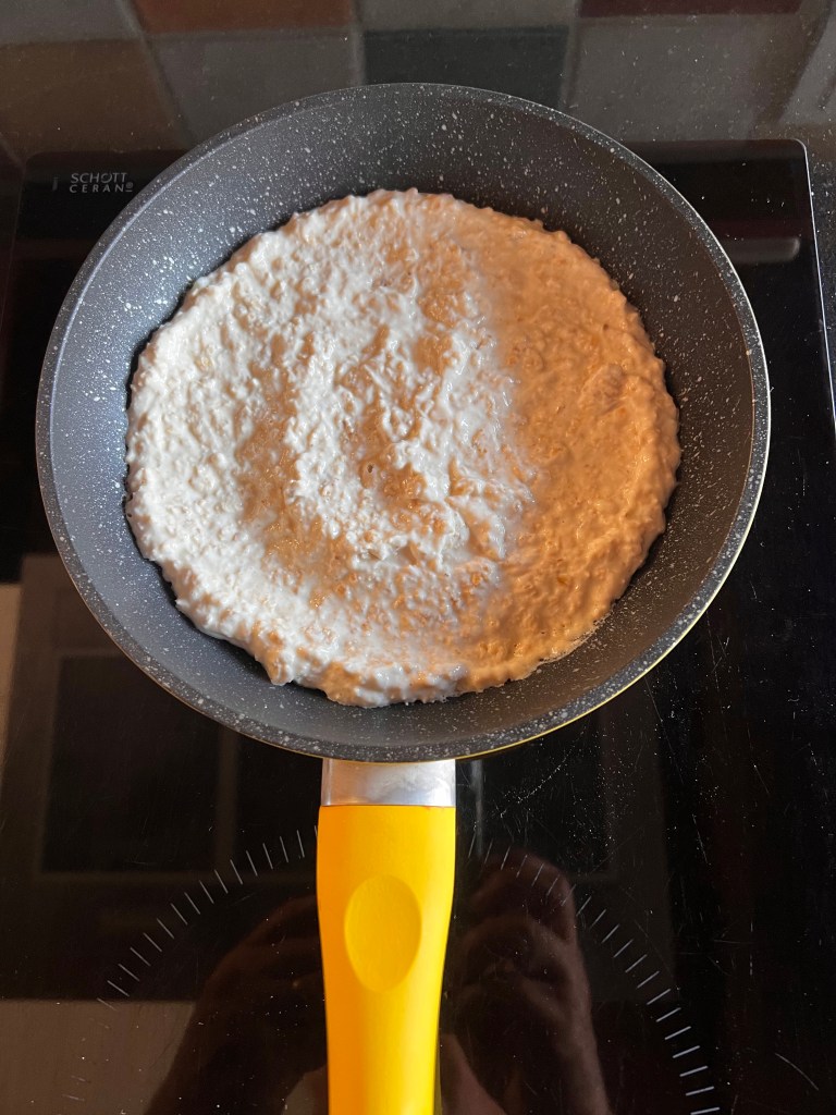Dans une petite poêle anti adhésive, faire cuire la préparation comme une crêpe à feu moyen.