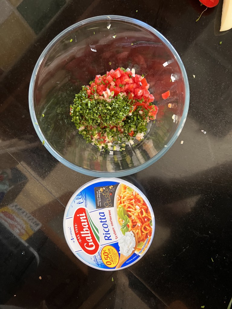 Mettre le tout dans un saladier, ajouter la ricotta, les lardons de saumon coupés en petits dés, remuer doucement avec une fourchette.