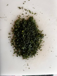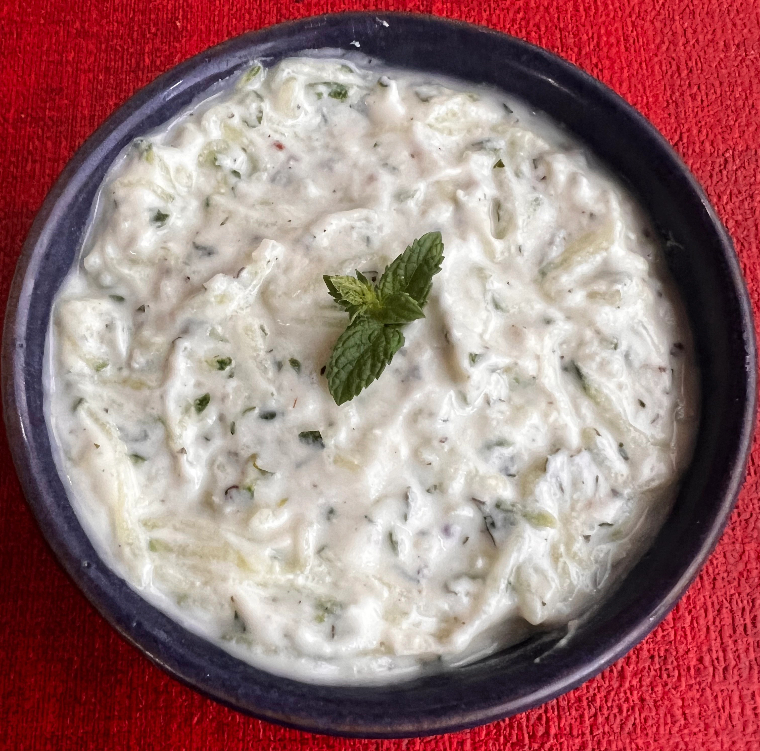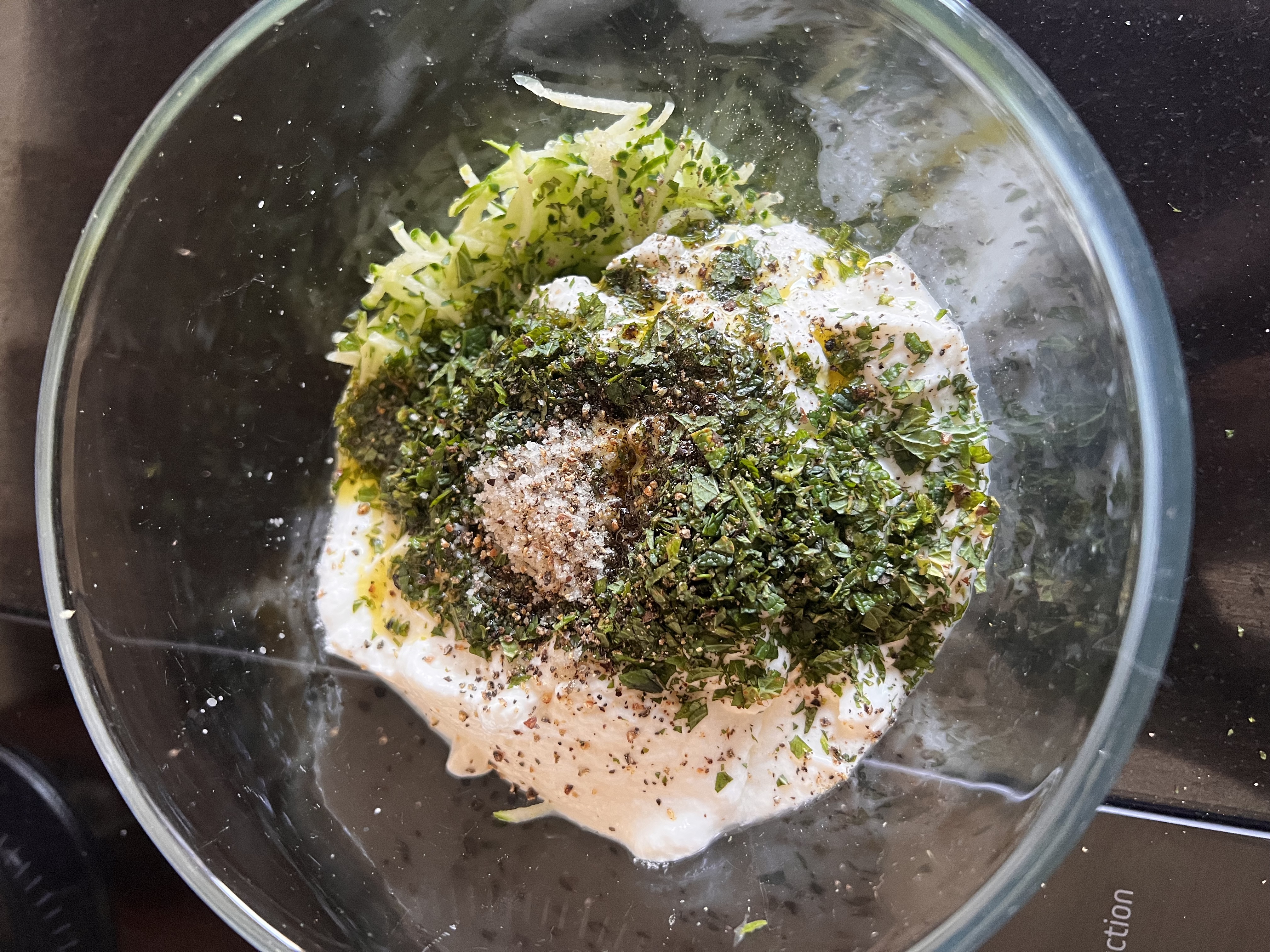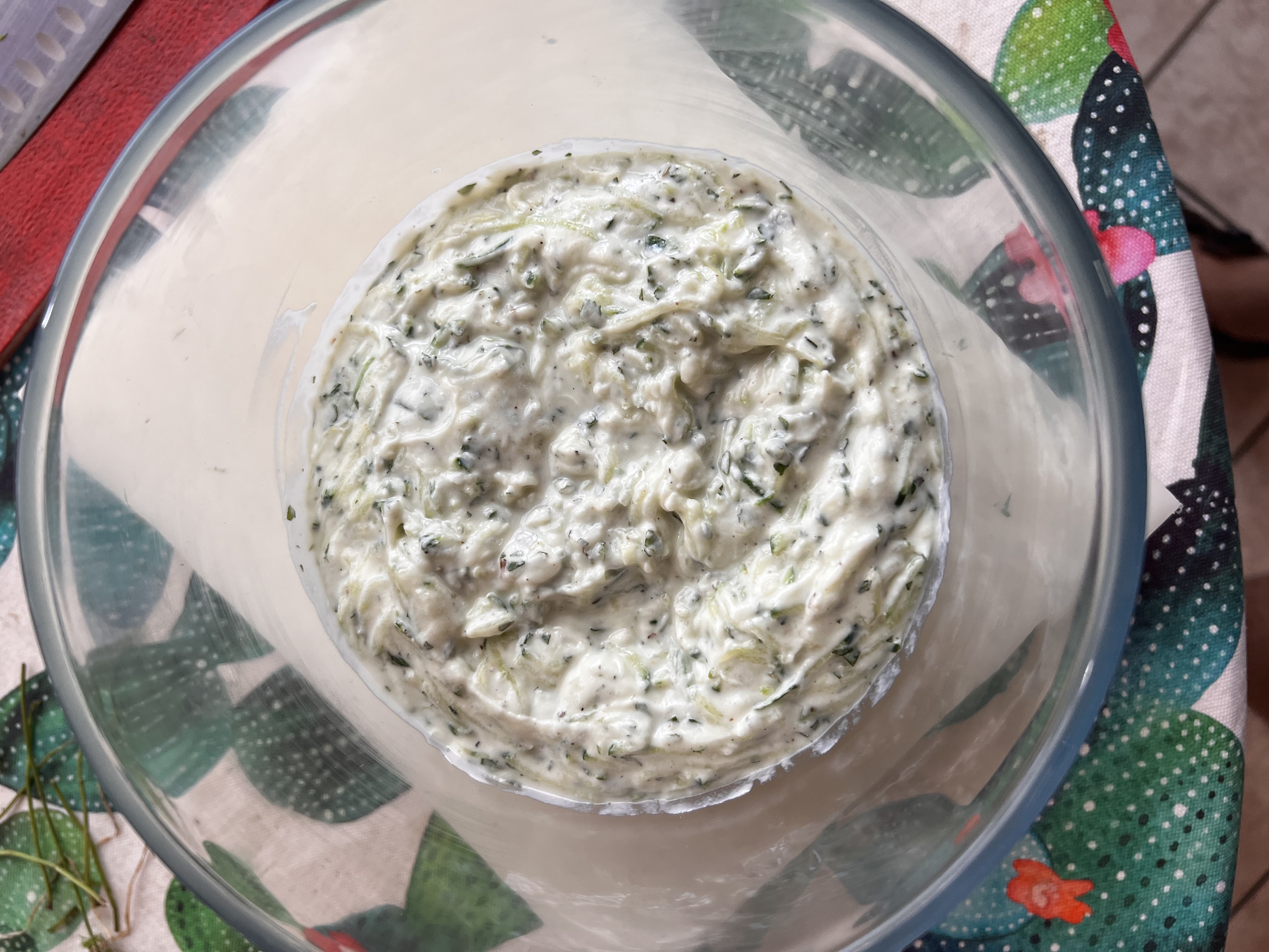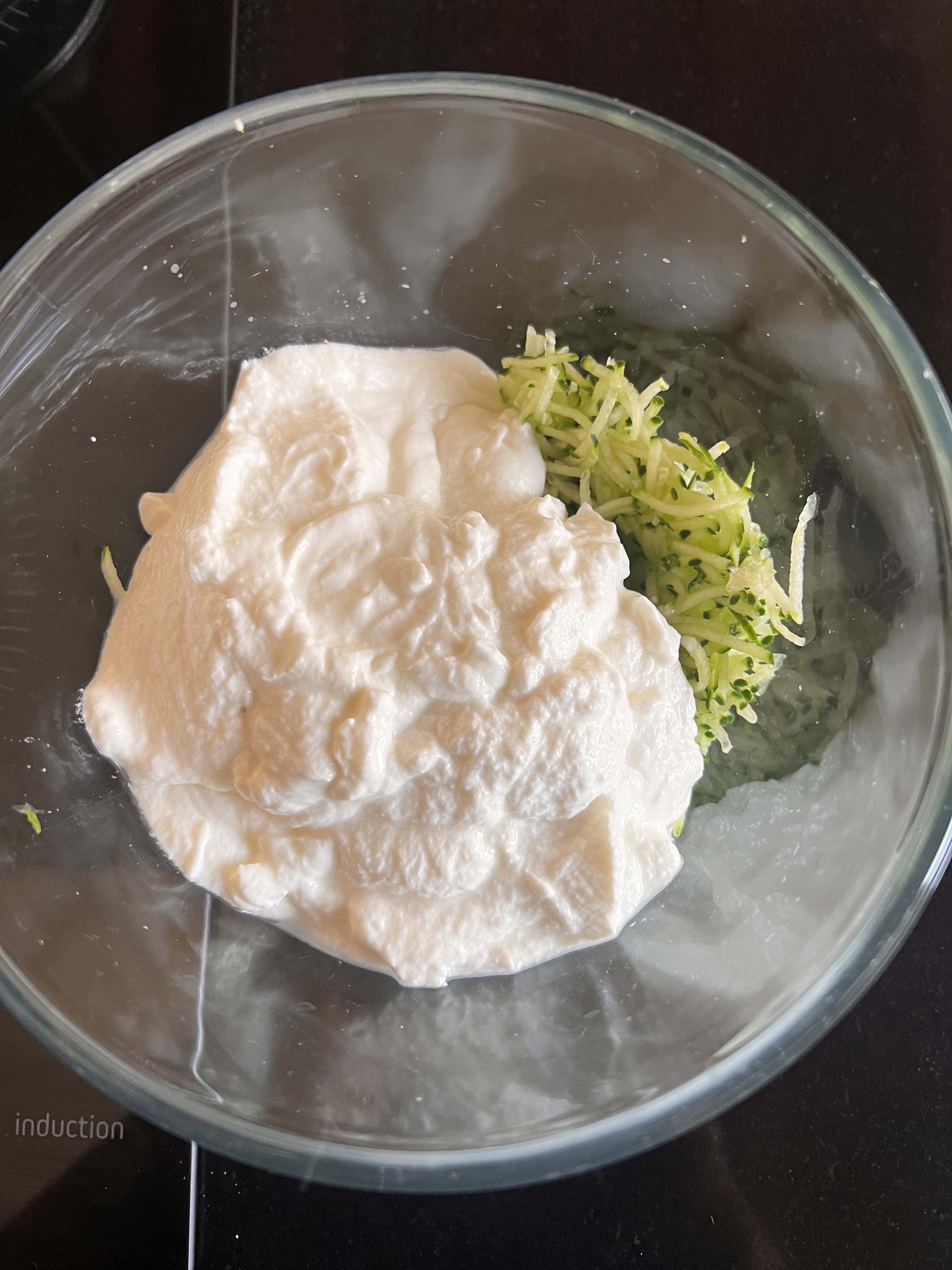 Dans un saladier mettre le concombre râpé, l’ail, le sel, le poivre, l’huile d’olive, ajouter la menthe ciselée.