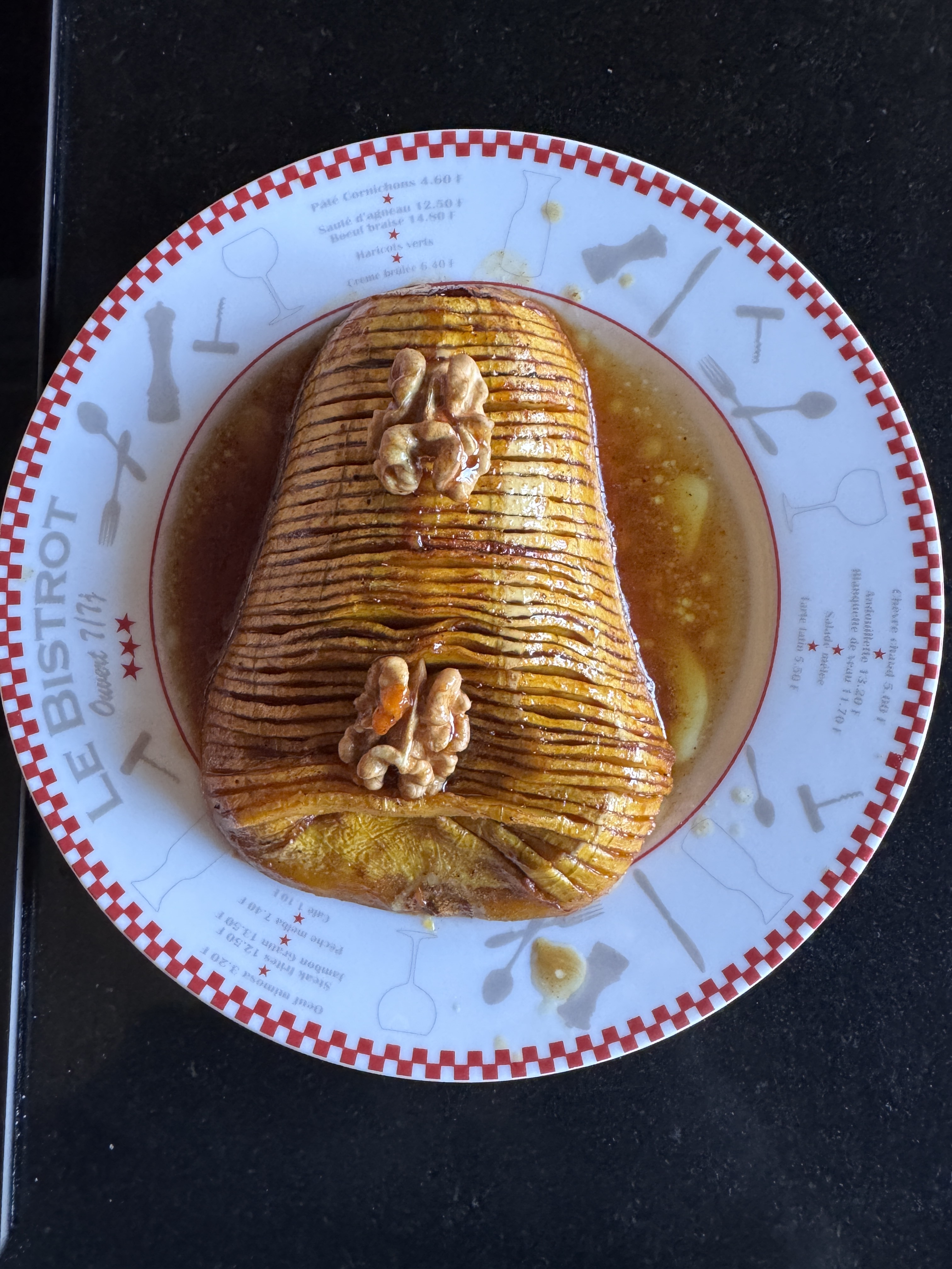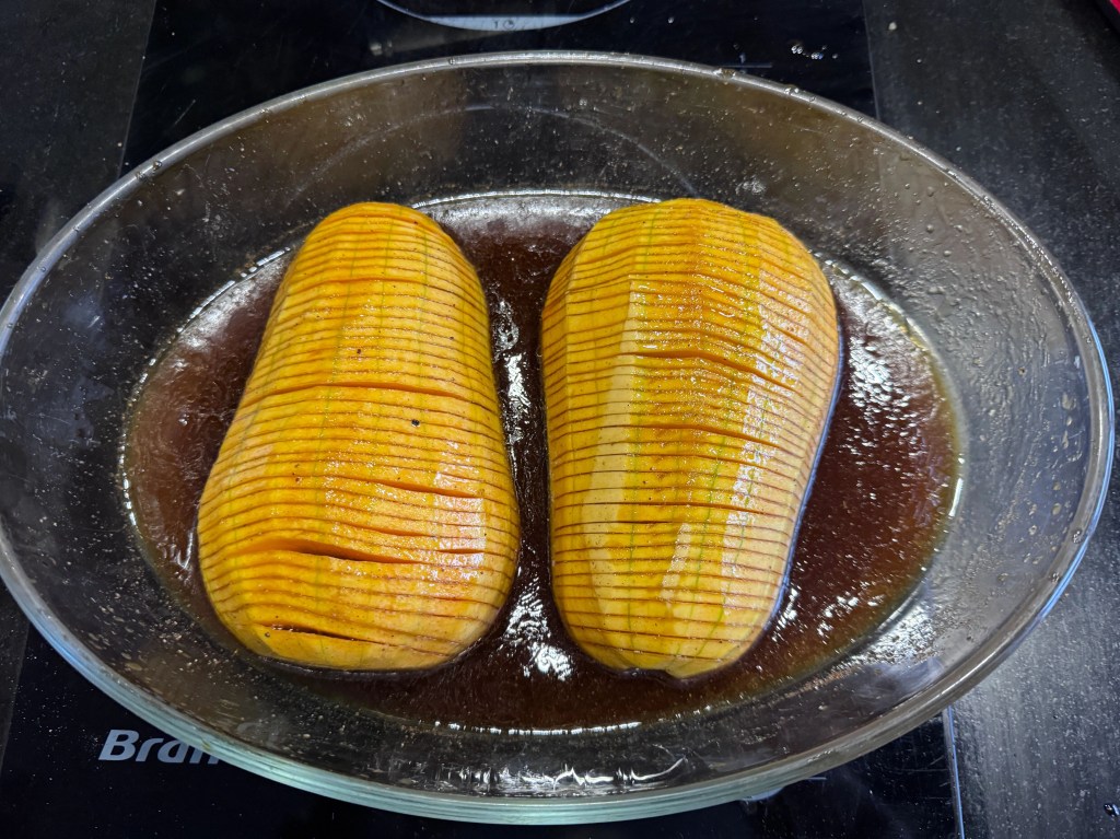 Placer de chaque coté de la courge une brochette en bois et coupez chaque demi butternut en tranches sans aller jusqu’au bout.