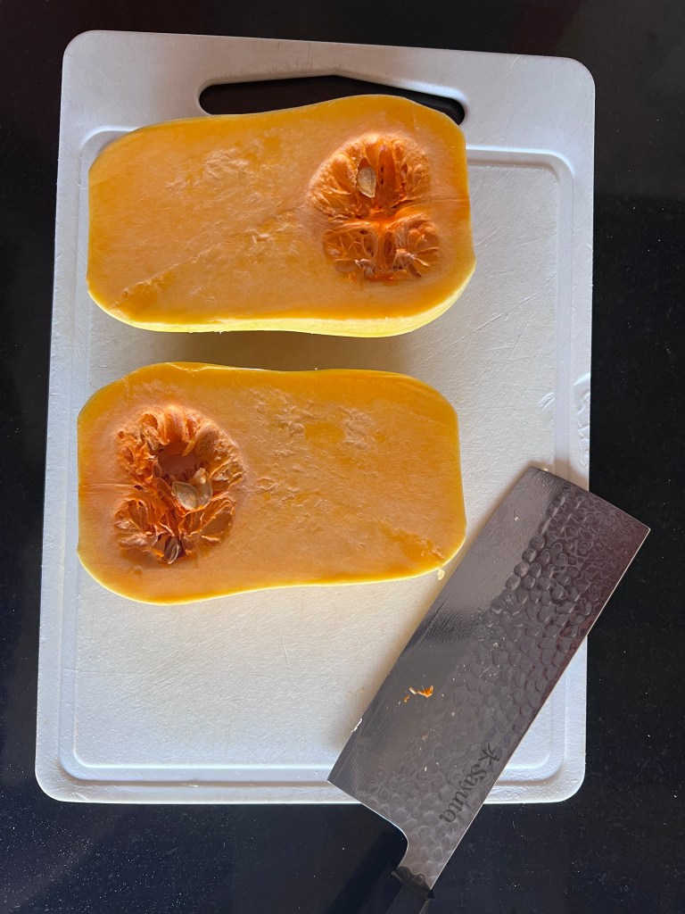 Eplucher et couper la butternut en deux dans le sens de la longueur.