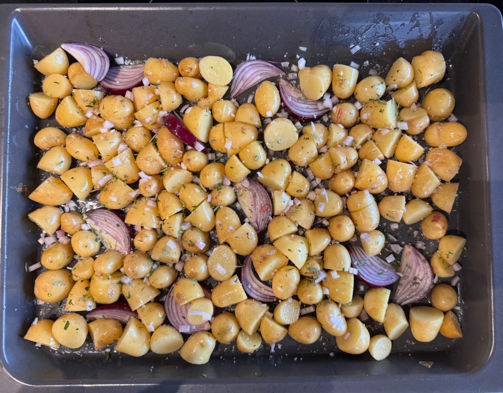 Couper l’oignon rouge en quartier, ajouter aux pomme de terre, mélanger à l’aide d’une spatule.