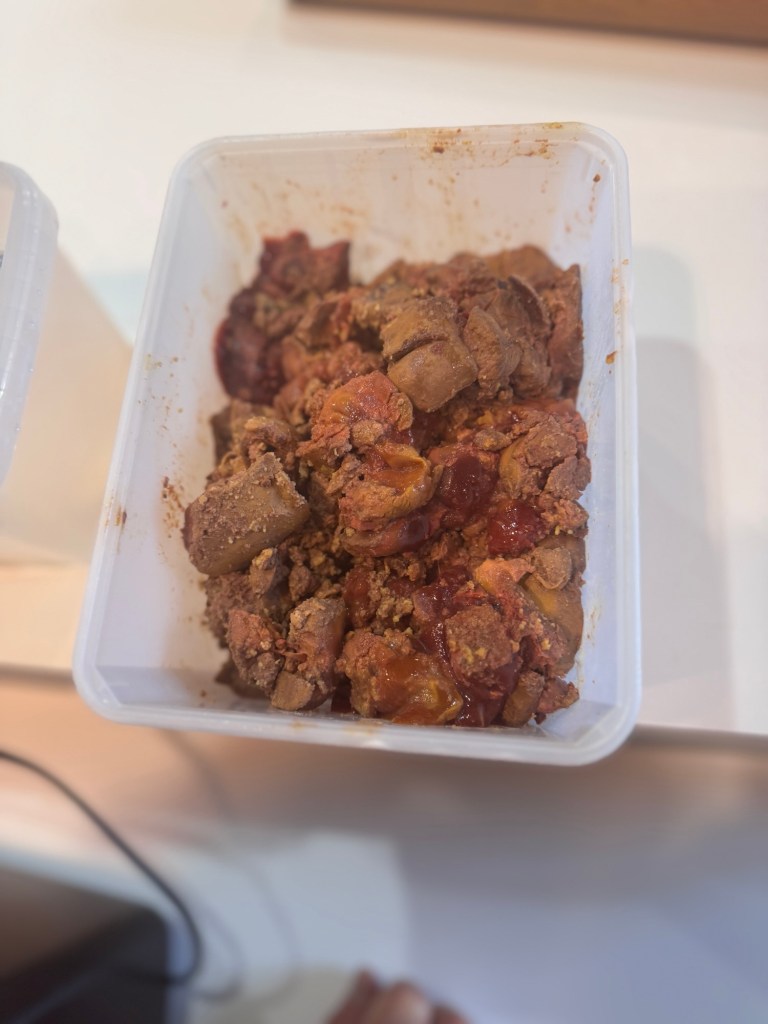 80 gr de poulet en cube préalablement sauté à la poele au beurre et au curcuma et Paprika doux.