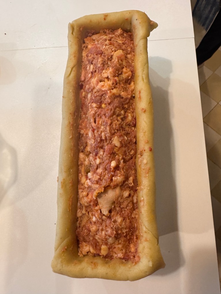 A l’aide d’un pinceau mettre de la dorure sur la pate du haut du moule et recouvrir avec un rectangle du reste de pate, en faisant un bourrelet pour sceller le pâté.