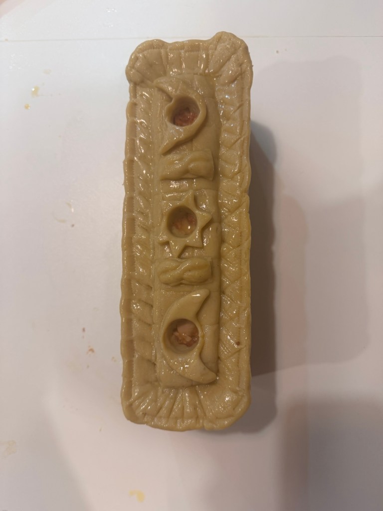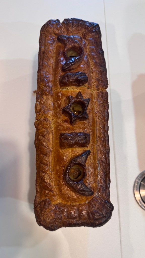 Faire deux ou 3 trous a l’aide d’un emporte pièce pour les cheminées et badigeonner le pâté avec la dorure à l’aide d’un pinceau.