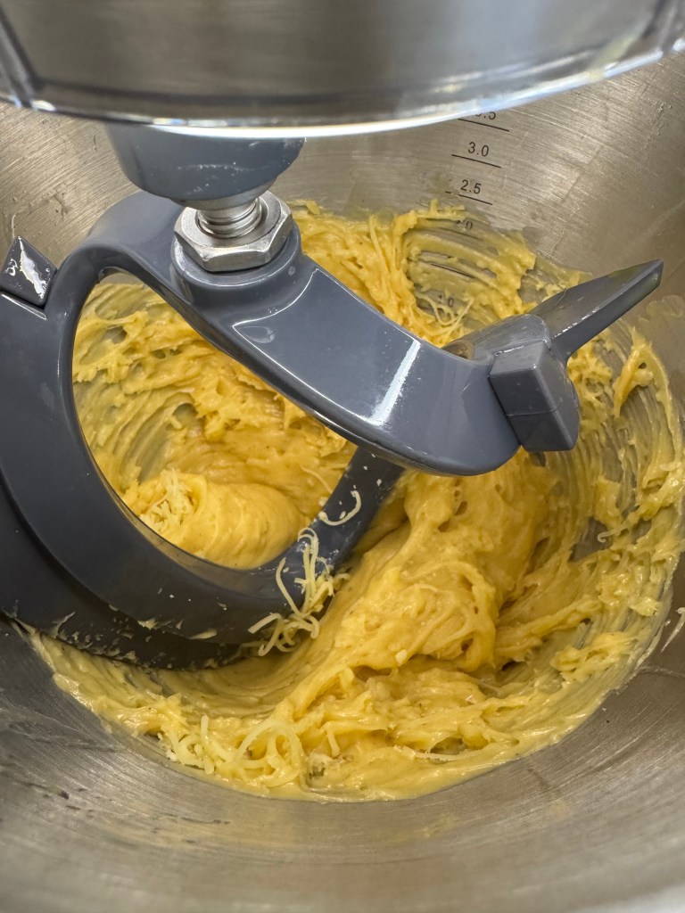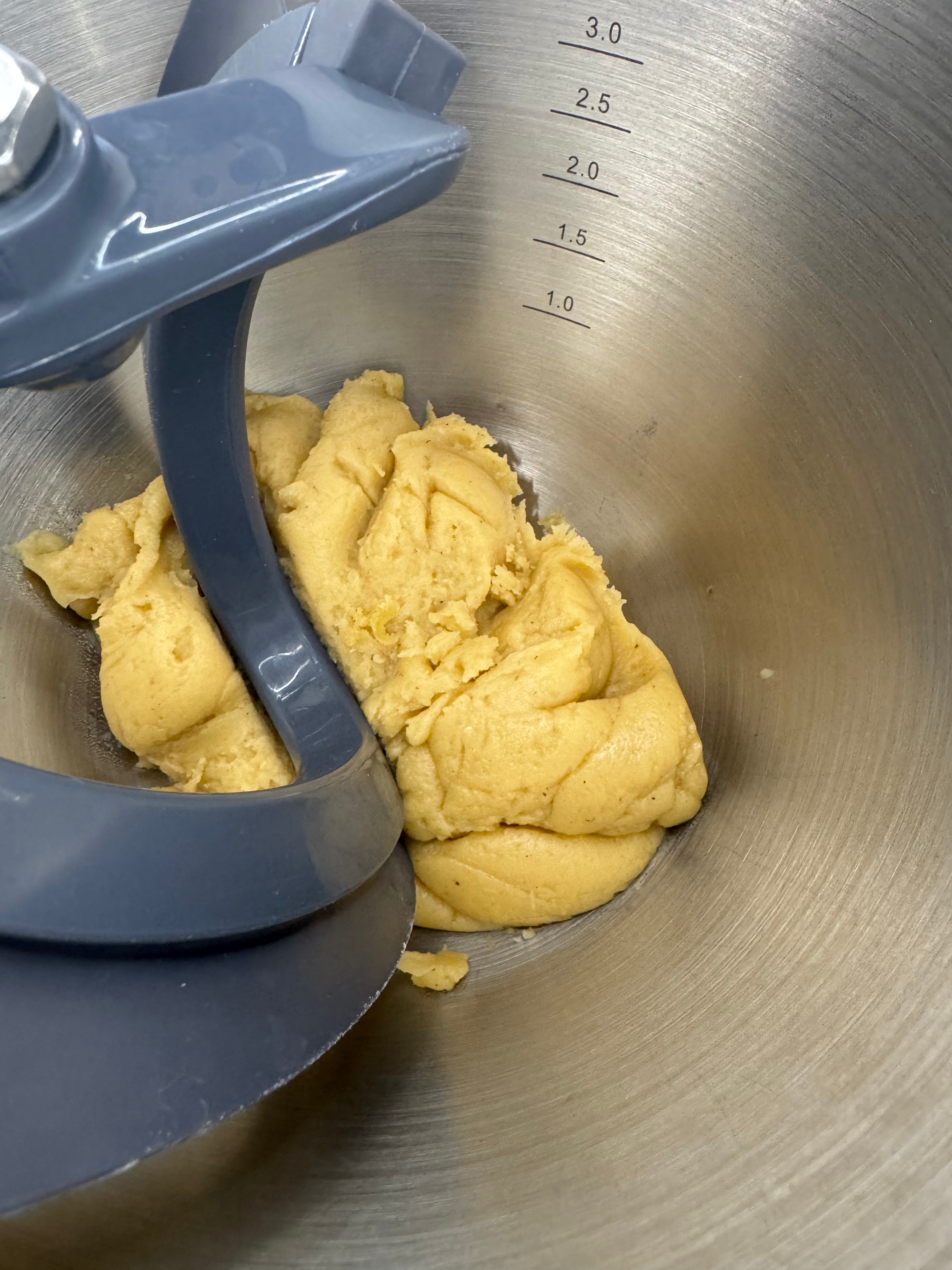 Mettez la panade dans le bol du robot et installez le batteur souple. Réglez la vitesse sur 2 et validez. Ajoutez les oeufs petit à petit en attendant qu’ils soient bien incorporés avant de continuer.