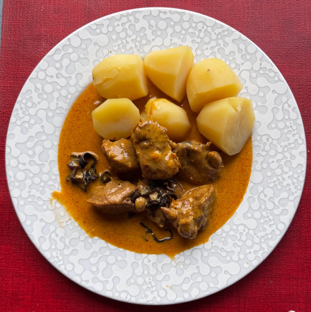 Servir avec des pommes de terre cuite à l’eau ou du riz.